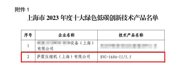 近日,在上海市經濟和信息化委組織開展的“綠色低碳技術產品”征集活動中,通過專家評審會技術評審,薩震壓縮機(上海)有限公司產品榮獲上海市綠色低碳技術產品!該產品超越我國標準,比一般節能空壓機節能約30%左右。